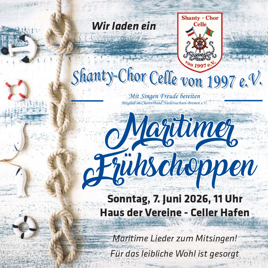 Die Stadt Celle veranstaltet 2026 am 09. und 10. Mai ein Hafenfest im Celler Hafen.Am 09. Mai treten vier Shantychöre auf, wobei der Shantychor Celle als erstes auftritt. Beginn ist um 15:00 Uhr. Wir begrüßen hoffentlich viele Zuhörer und freuen uns auf begeisterte Mitsinger, also auf gehts ihr Seebären und Seebärinnen am 09. Mai in den Celler Hafen. Shiff Ahoi!